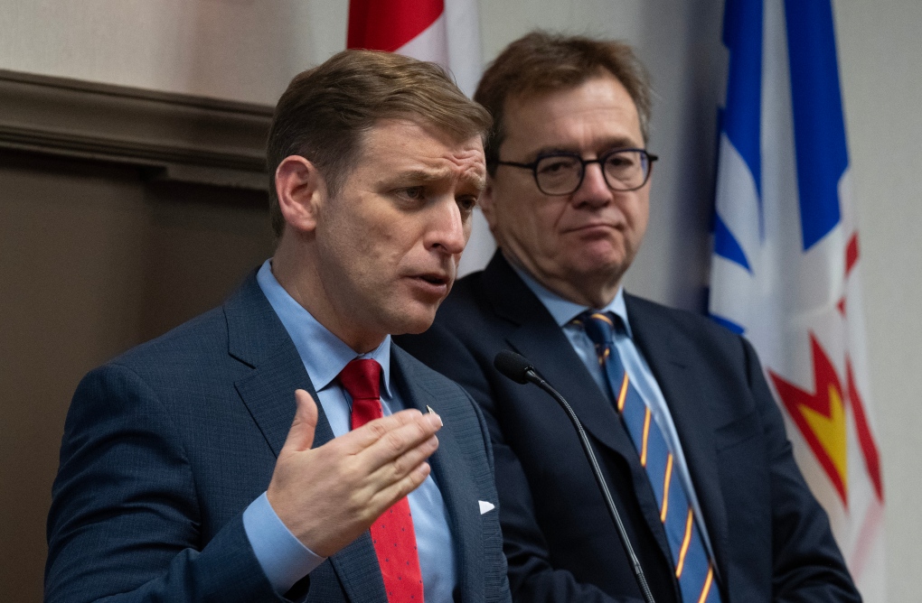 Energy and Natural Resources Minister Jonathan Wilkinson, right, looks on as Newfoundland and Labrador Premier Andrew Furey responds to a question during an event, Dec. 6, 2023 in Ottawa (Adrian Wyld / THE CANADIAN PRESS)